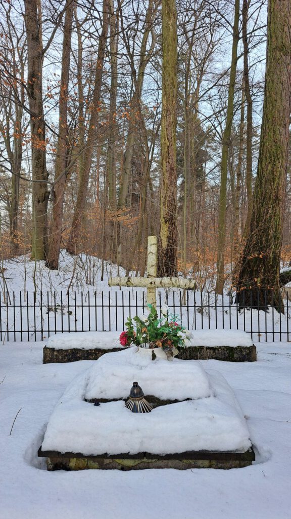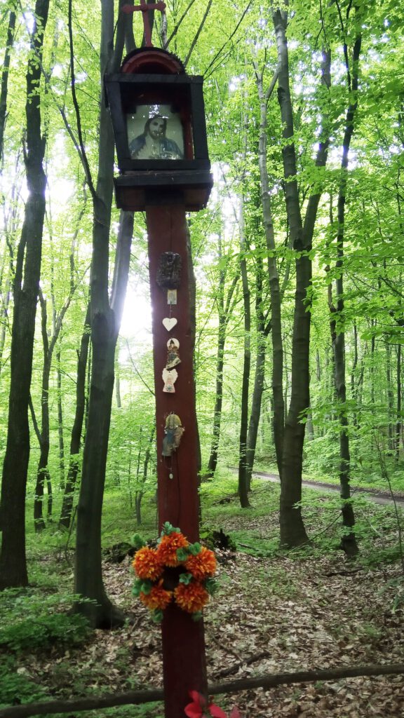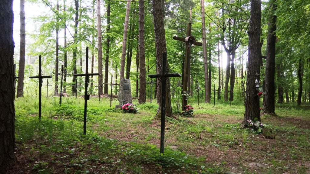 Po około 1,8 km biegu dobiegamy do rozwidlenia dróg, na którym mijamy kapliczkę leśną. My podążamy w prawo (czyli pozostajemy na szlaku rowerowym). Po przebiegnięciu około 2,5 km (od początku biegu) pod górę, szlak się wypłaszcza. Szlak rowerowy skręca mocno w prawo, a do prostej drogi leśnej dołącza żółty szlak pieszy (Szlak Dolinek Jurajskich), którym biegniemy. Po około 500 metrach dobiegamy do skrzyżowania asfaltowych dróg, przecinamy je i podążając za wskazaniami strzałki informacyjnej, kierującej do cmentarza cholerycznego z okresu I wojny światowej, wbiegamy w jedyną nieasfaltowaną ścieżkę. Po około 150 metrach dobiegamy do małego leśnego cmentarza. Naprawdę warto go obejrzeć.