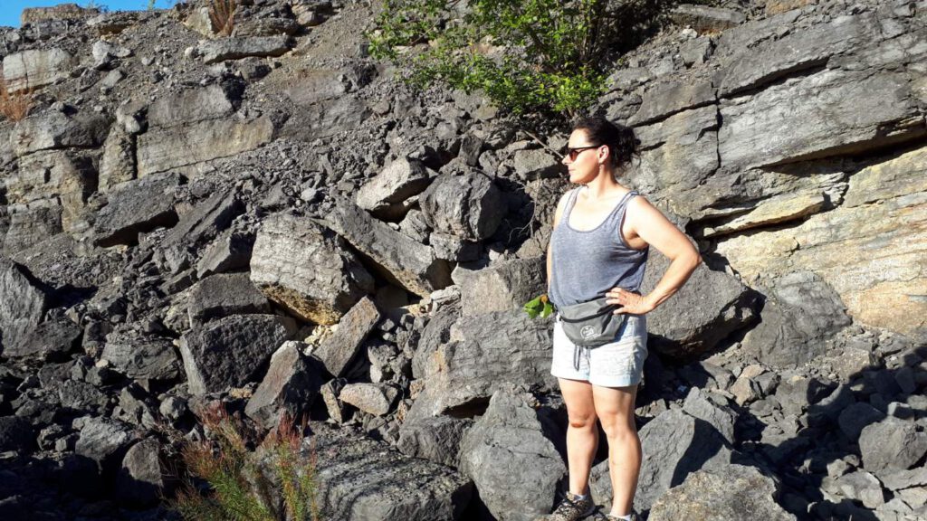 Wracamy na skrzyżowanie i kierujemy się w lewo do miejscowości Dębnik. Asfaltową drogą biegniemy przez miejscowość, po lewej stronie mając las. Z lewej strony mijamy stare wyrobisko kamieniołomu. Biegniemy dalej i po około 1 km docieramy do starego wyrobiska kamieniołomu Karmelicka Góra, które jest naszym celem. Starą drogą, wyłożoną granitową kostką wbiegamy na dół. Tam jest czas na małe rozciąganie, a przede wszystkim na baczne rozejrzenie się wokół. Jesteśmy w nieczynnym już kamieniołomie Karmelicka Góra, w którym wydobywano czarny marmur dębnicki. To krajobraz iście księżycowy; łatwo tu zapomnieć, że jesteśmy w Polsce, zwłaszcza jeżeli zdecydujemy się na bieg w upalny dzień.