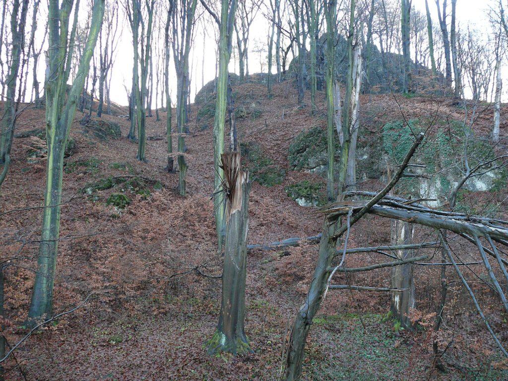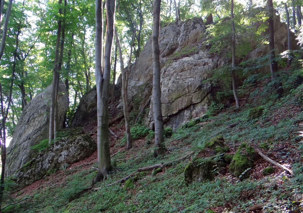 Po około sześciuset metrach widzimy w lewej strony trasy grupę potężnych skał i odbijającą w ich stronę ścieżkę. Wbiegamy na nią i biegniemy ostro w dół aż do skał. To grupa Plaskula. Następnie – mocno pod górę – wracamy na naszą główna trasę.