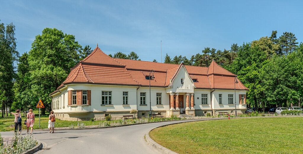 Po opuszczeniu fortu skręcamy w lewo i, wciąż jadąc Szlakiem Twierdzy Kraków, pedałujemy dalej aż do Klubu Sportowego „Kobierzyn” przy ulicy Spacerowej. Skręcamy w prawo, a następnie, po przejechaniu 200 metrów, w lewo w uliczkę pomiędzy budynki. Na końcu uliczki skręcamy w prawo, a po 100 metrach w lewo na główną aleję prowadzącą do zabytkowego budynku administracyjnego Szpitala Klinicznego im. dr. Józefa Babińskiego w Krakowie, czyli dawnego Zakładu dla Nerwowo i Umysłowo Chorych w Kobierzynie pod Krakowem. Jesteśmy na terenie zabytkowego kompleksu szpitalnego z początku XX wieku. Teren jest ogólnodostępny i spokojnie można się po nim poruszać, a naprawdę warto! Przy głównej alei mijamy Teatr/Dom Kultury szpitala i willę dyrektora i wyjeżdżamy wprost na rondo, przy którym stoi budynek administracji.