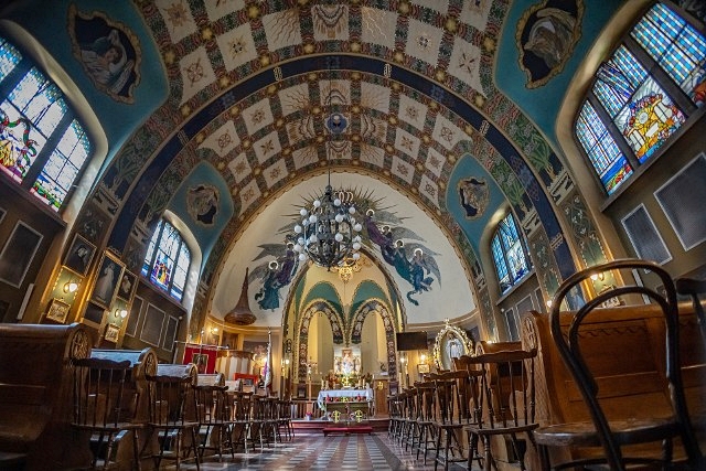 Po objechaniu kościoła kierujemy się w prawo i mijając z prawej strony bistro, a z lewej budynek prosektorium, dojeżdżamy do granicy kompleksu szpitalnego.